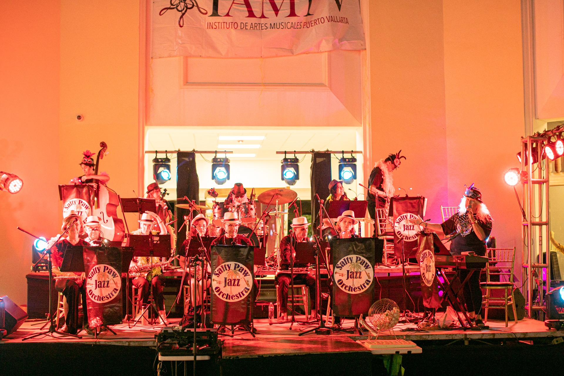 La Orquesta de Jazz Salty Paw es una agrupación que interpreta música de muchas épocas, desde los éxitos del jazz de los 40 hasta la música pop contemporánea en arreglos de jazz. La instrumentación incluye metales, guitarra, bajo, piano, instrumentos de madera y hasta chelo. Es un grupo que no requiere audiciones para entrar. Cualquiera que pueda leer música es bienvenido a unirse, desde jóvenes estudiantes hasta profesionales experimentados. Cada músico tiene la oportunidad de brillar con solos improvisados. Los ensayos son semanales durante todo el año, pero los visitantes ocasionales a Puerto Vallarta que sólo visitan durante la temporada alta pueden integrarse también. La SPJO se presenta en espacios públicos y en eventos de recaudación de fondos para IAMPV. Los intérpretes no solo tienen la oportunidad de tocar grandes arreglos, sino que también se divierten con otros artistas con mentalidad similar.